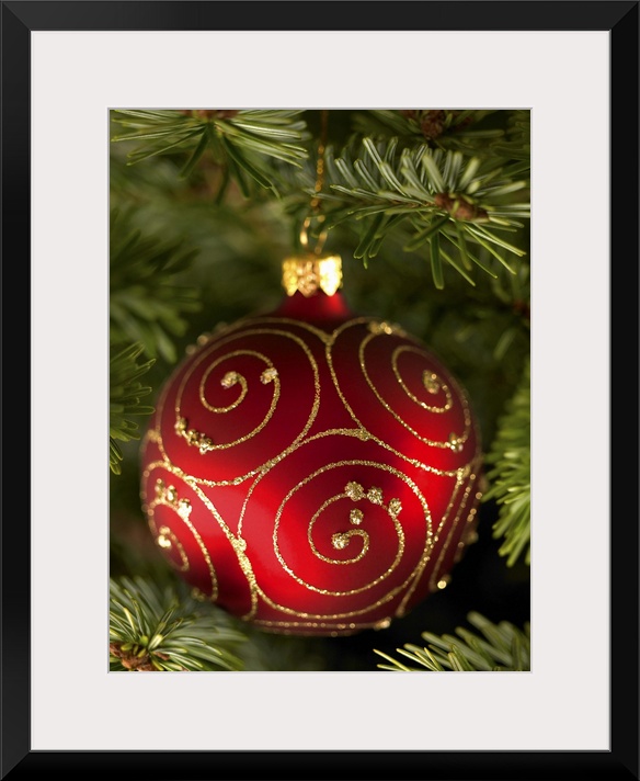 <p>Red bauble decoration hanging on Christmas tree.</p>