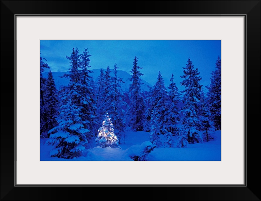 <p>Huge photograph emphasizes a small spruce tree decorated with seasonal lights as it sits amongst a woodland thick with trees that have all been blanketed with fresh snow. In the background there is a faint outline of a large mountain.</p>