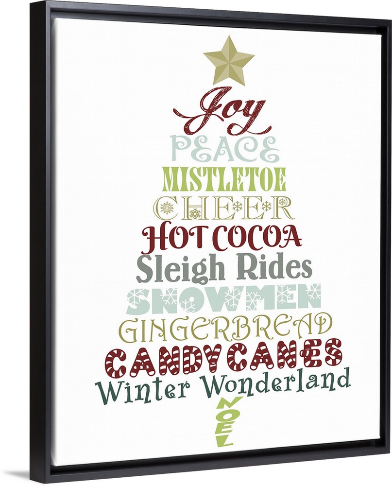 <p>An assortment of lyrics from Christmas songs in different fonts and colors in the shape of a tree.</p>