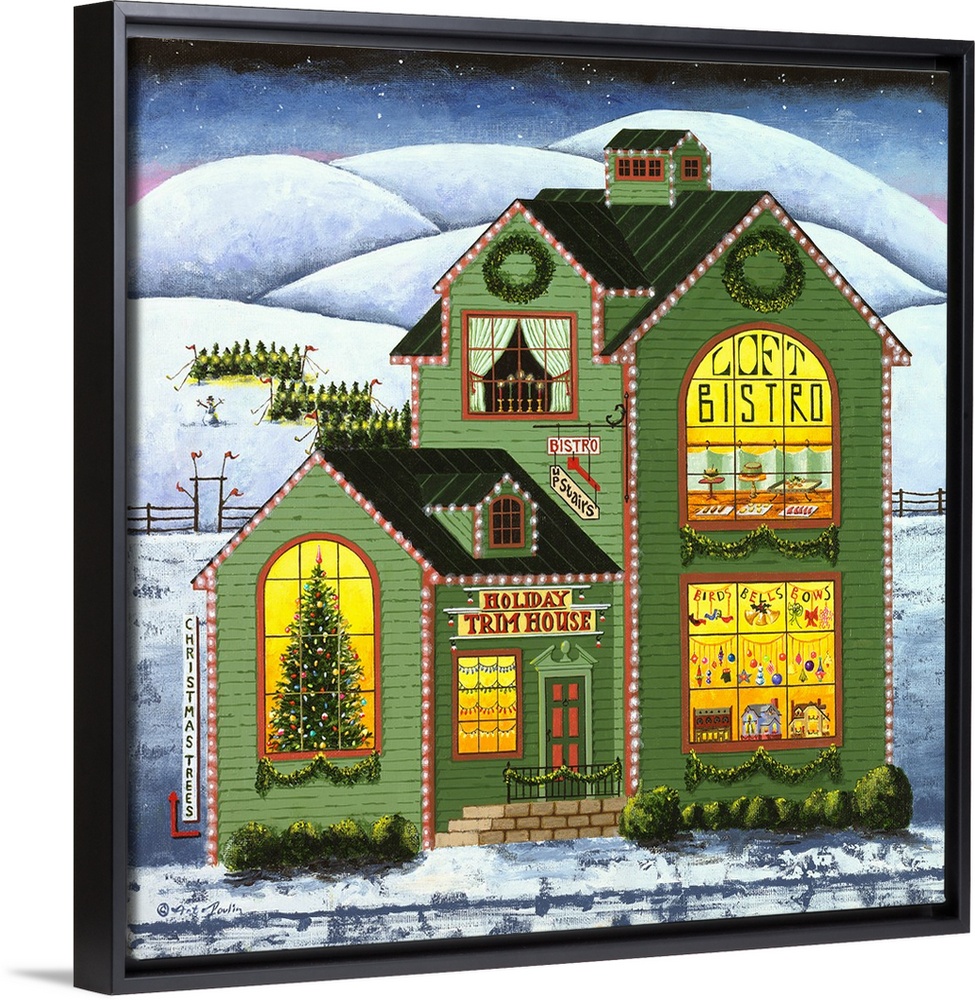 <p>Americana scene of a shop selling Christmas decorations with a bistro upstairs.</p>