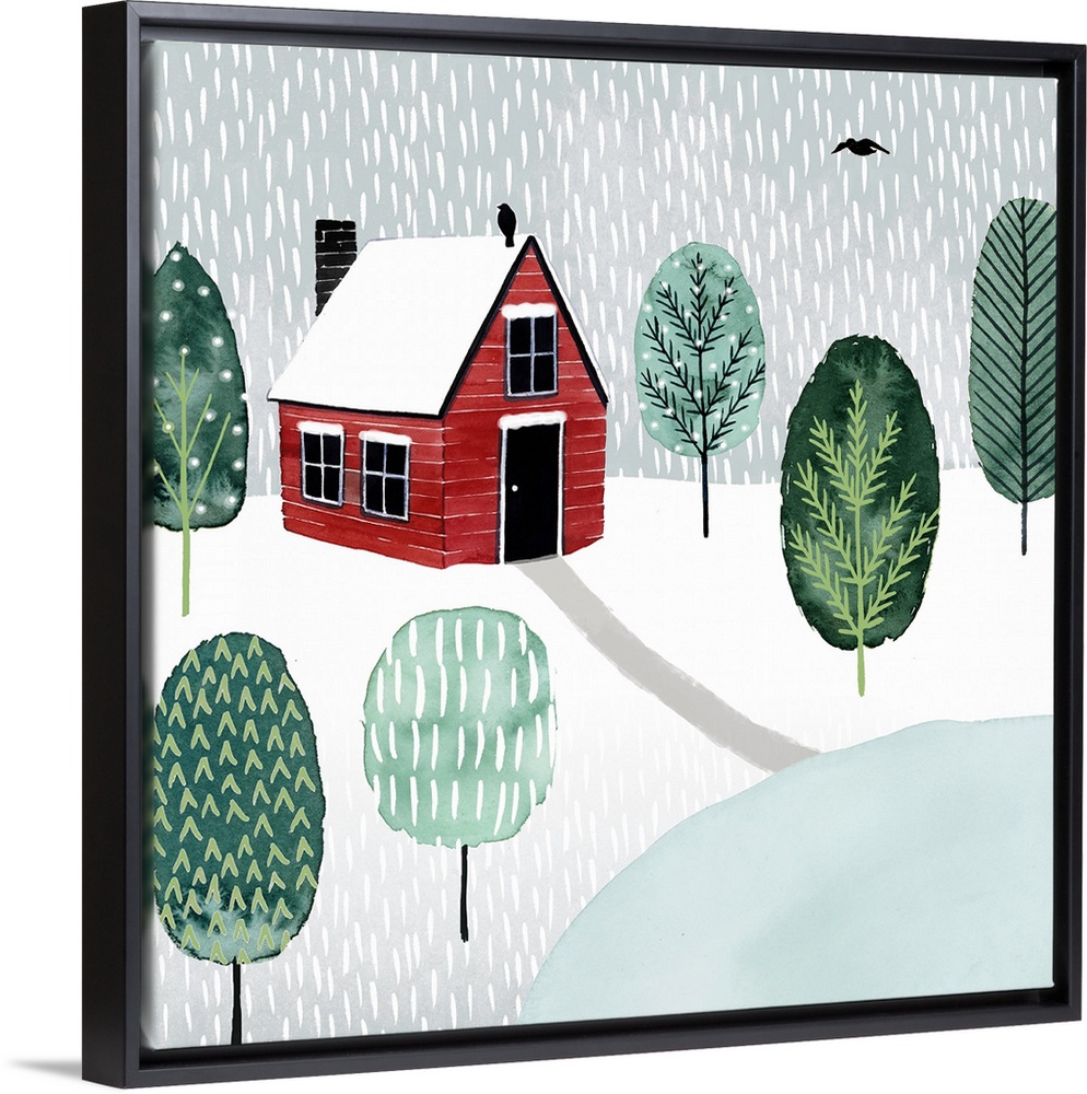 <p>A snowy landscape image of a red house surrounded by trees near a pond, with snow falling and a bird flying in the sky.</p>