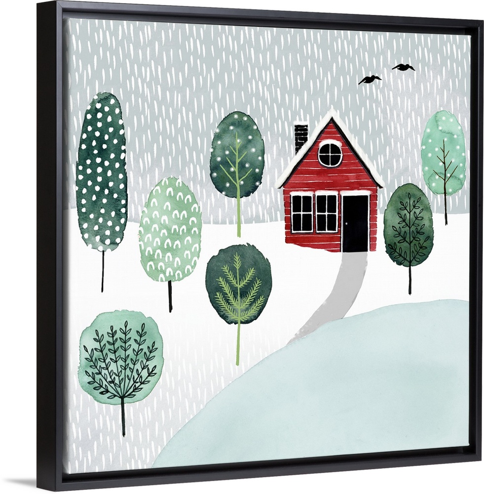 <p>A snowy landscape image of a red house surrounded by trees near a pond, with snow falling and a bird flying in the sky.</p>
