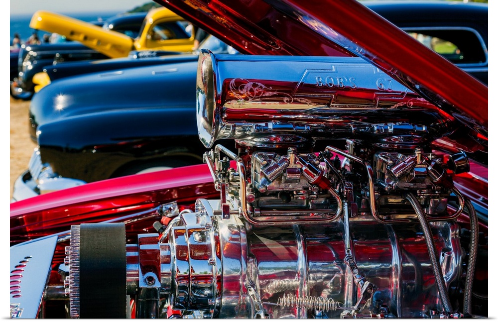 <p>Chrome-plated hot rod engine at antique car show, cape ann, gloucester, massachusetts, USA.</p>