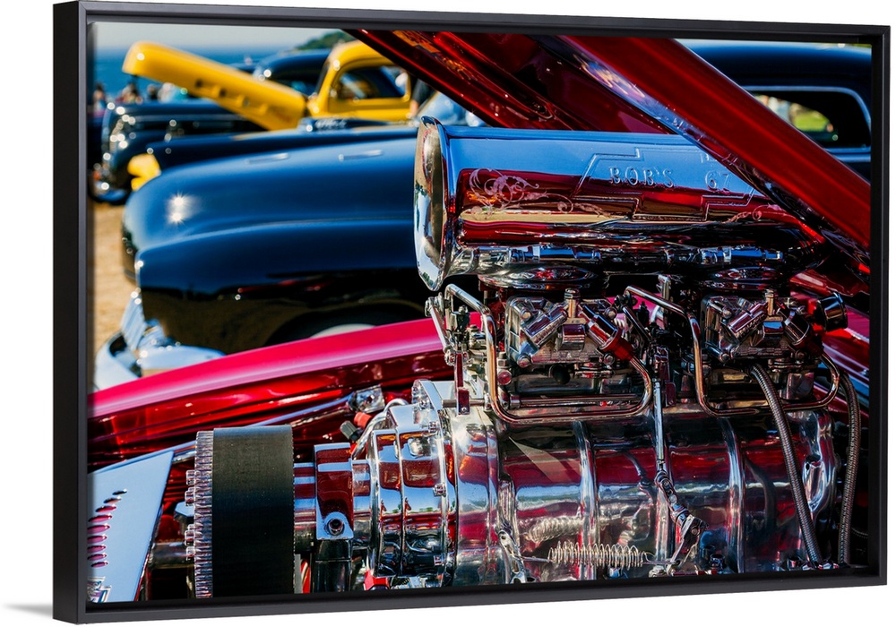 <p>Chrome-plated hot rod engine at antique car show, cape ann, gloucester, massachusetts, USA.</p>