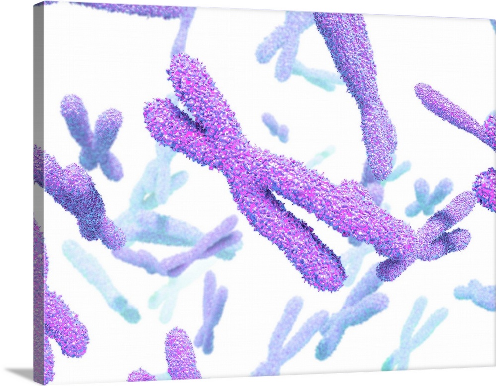 <p>Chromosomes. Computer illustration of human chromosomes. Chromosomes are composed of deoxyribonucleic acid (DNA) and contain sections, called genes, which encode the body's genetic information. Each chromosome consists of two chromatids joined at their centres by the centromere, which is involved in cell division. At the tip of each chromatid are the telomeres, whose function is to protect the ends of the chromosome from degrading.</p>