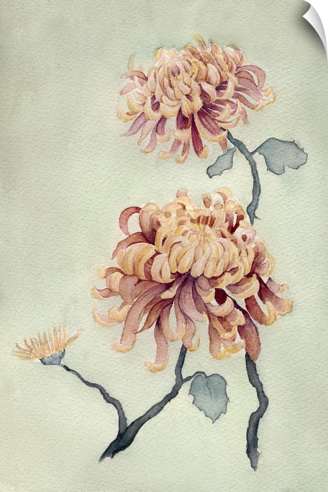 <p>Contemporary artwork of delicate chrysanthemum flowers over a neutral green background.</p>