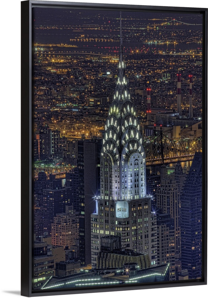 <p>Aerial vertical picture of the top of the Chrysler building lit up at night with the rest of downtown New York lit up in the background.</p>