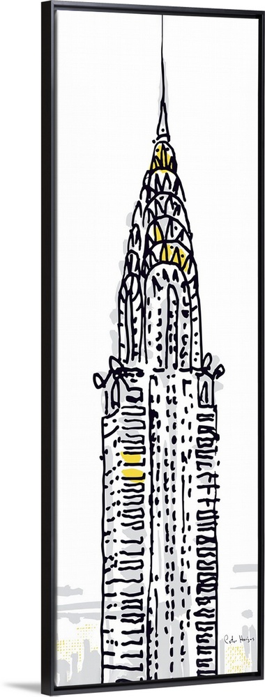 <p>Pen and ink illustration of the top of the Chrysler Building in New York City.</p>
