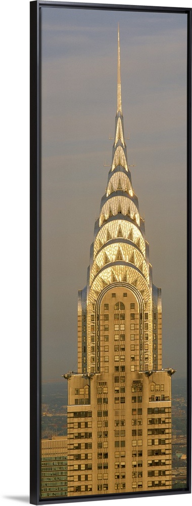 <p>Closeup photograph of the top of the Chrysler Building shining in the sun in New York City, NY (NY). Clouds and fog make up the background.</p>