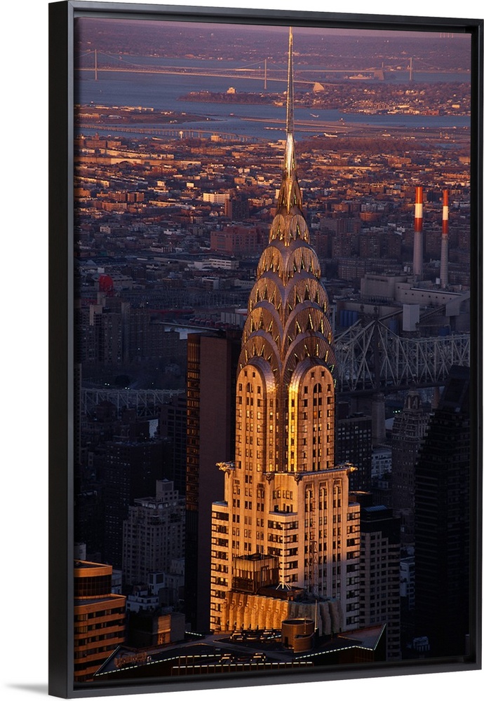 <p>Vertical, large aerial photograph of the Chrysler Building in the sunlight, in New York City.</p>