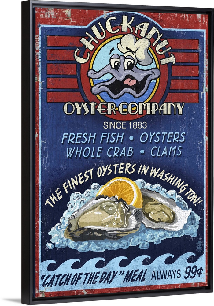 <p>Retro stylized art poster of a vintage seafood market sign displaying clams.</p>