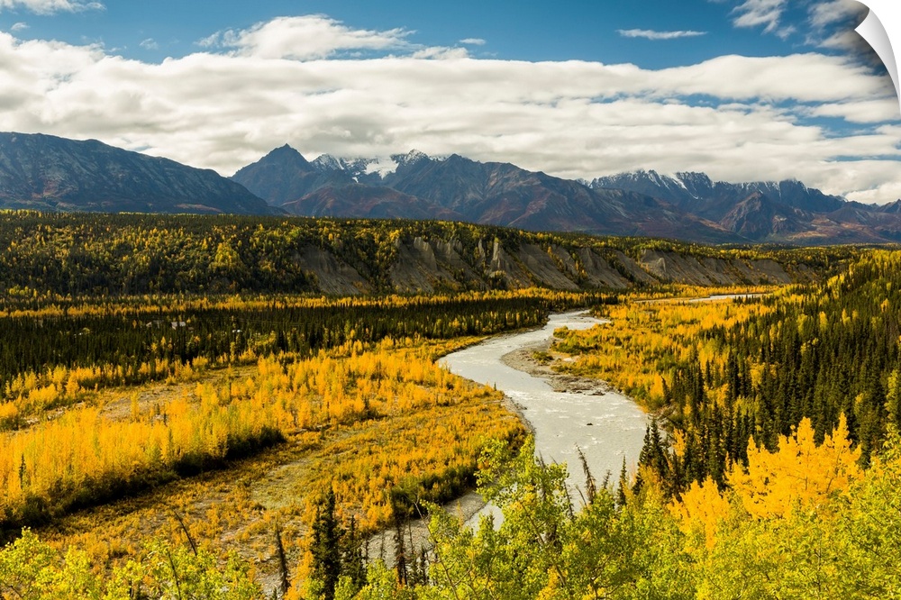 <p>Yellows in the valley and reds in the Chugach Mountains adorn the Matanuska River and valley in autumn in Alaska, afternoon.</p>