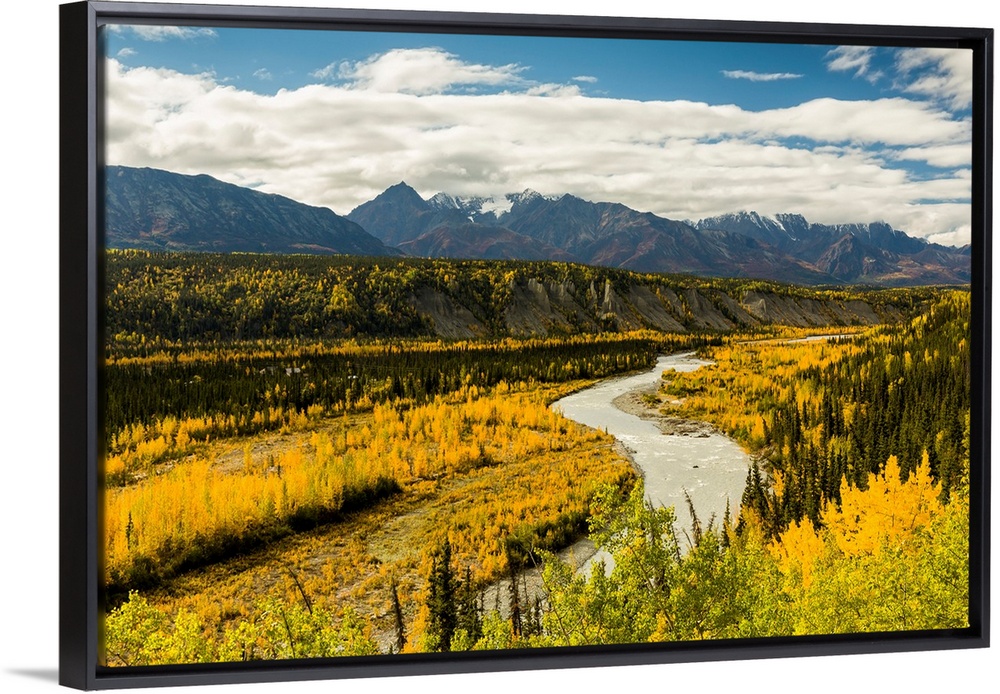 <p>Yellows in the valley and reds in the Chugach Mountains adorn the Matanuska River and valley in autumn in Alaska, afternoon.</p>