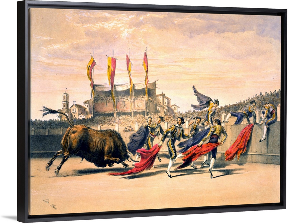 <p>Chulos Playing the Bull by William Henry Lake Price, showing chulos preparing the bull for the matador before a bullfight, c. 1860-70, color lithograph.</p>