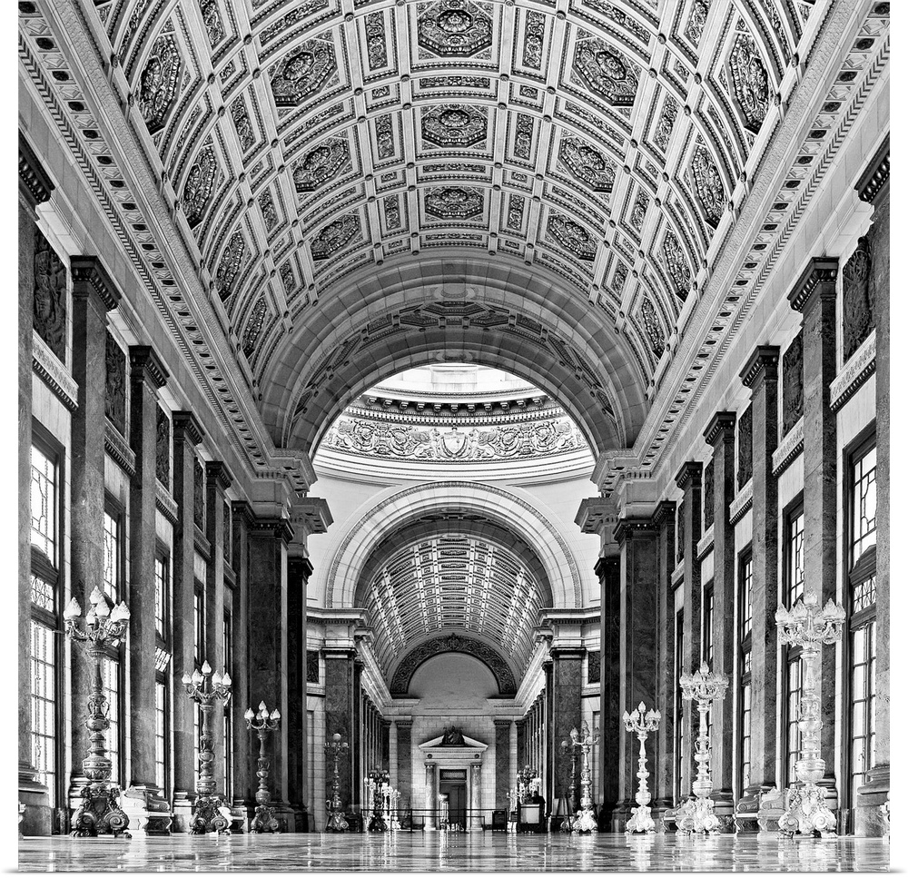 <p>A black and white photograph of the interior of a church, with arches and detailed ceilings.</p>