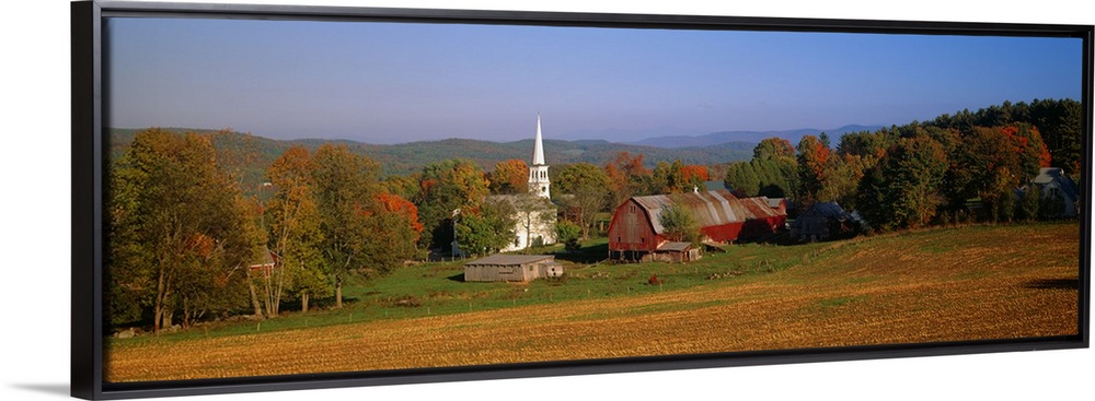 <p>This panoramic photograph is of a barn and a church surrounded by autumn trees with large hills in the distance.</p>