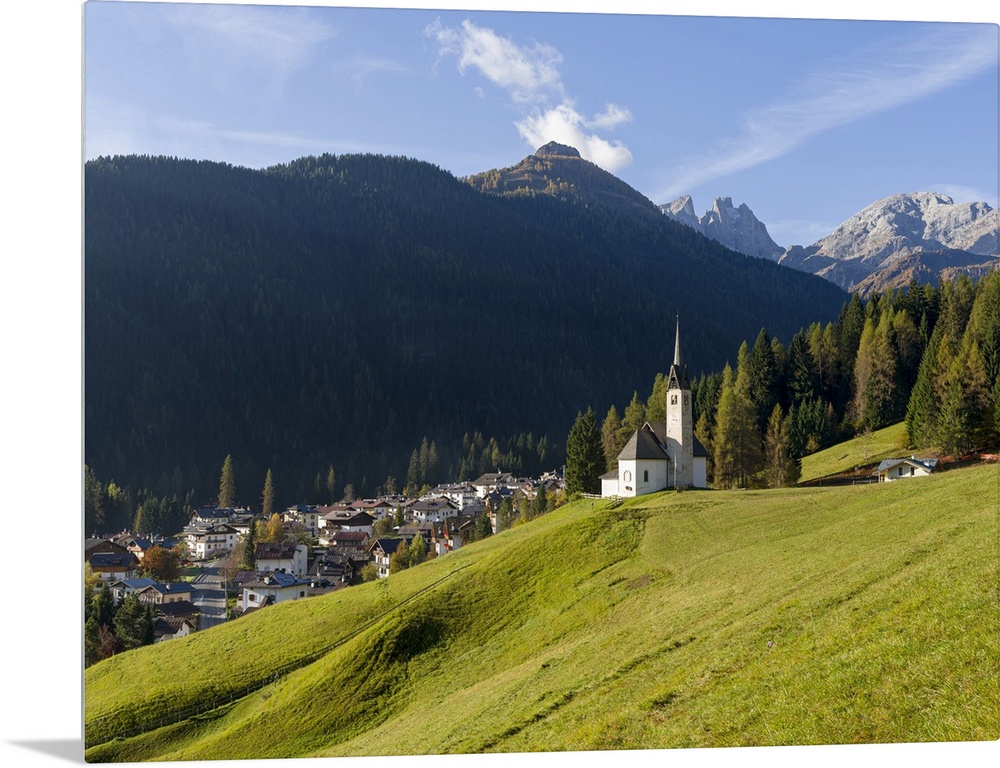 <p>Church And Focobon Mountain Range In The Pale Di San Martino, Caviola, Italy</p>
