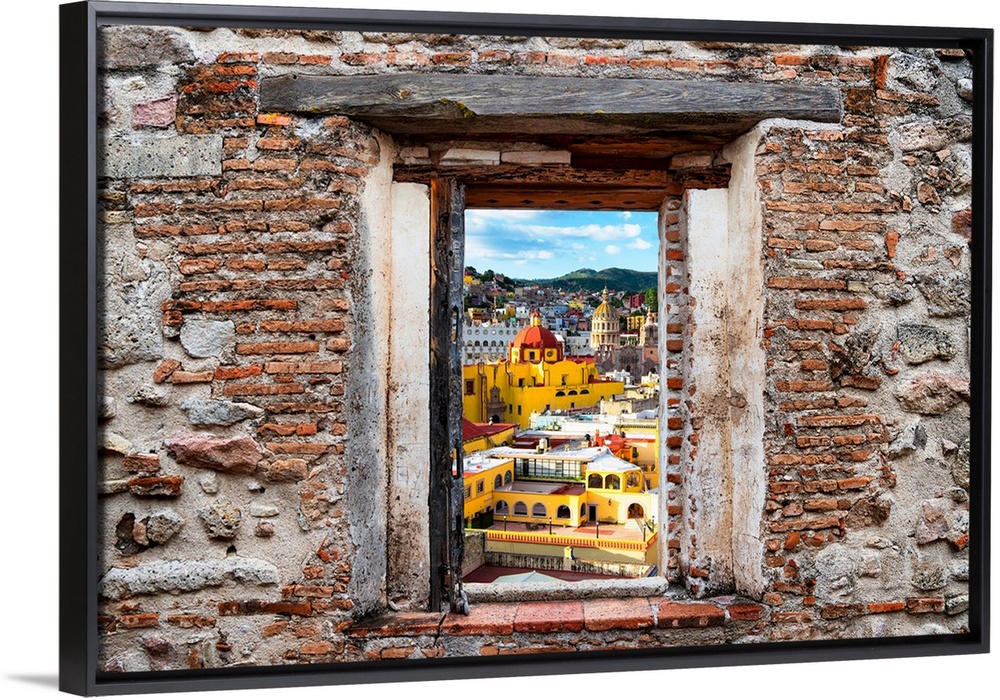 <p>View of the colorful city of Guanajuato, highlighting the church domes, framed through a stony, brick window. From the Viva Mexico Window View.</p>