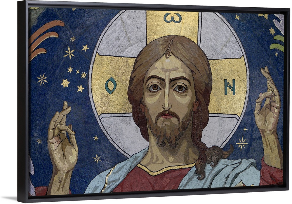 <p>Mosaic in the central dome of Christ the Pantocrator, designed by Nikolai Kharlamov, Church of Our Saviour on Spilled Blood, St. Petersburg, Russia, Europe.</p>