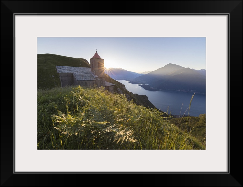 <p>Sunbeam on Church of San Bernardo lights up the landscape around the blue water of Lake Como at dawn, Musso, Lombardy, Italy, Europe</p>