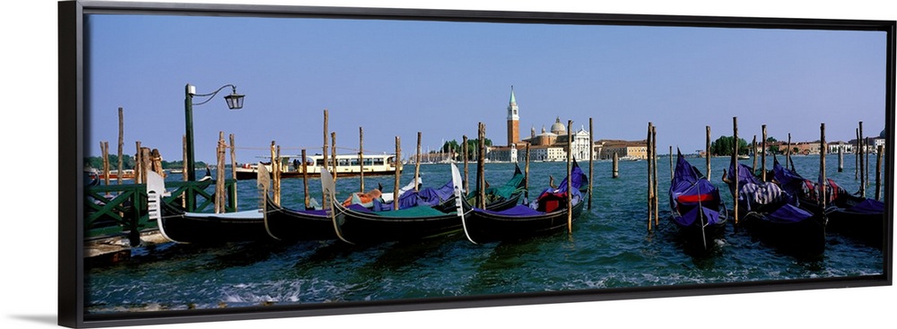 <p>Long photo on canvas of gondolas parked near posts in Italy.</p>