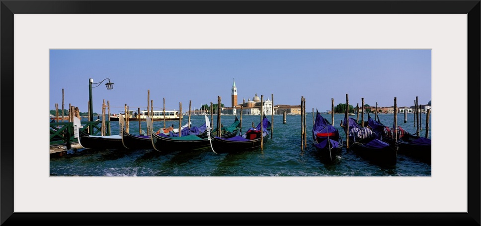 <p>Long photo on canvas of gondolas parked near posts in Italy.</p>