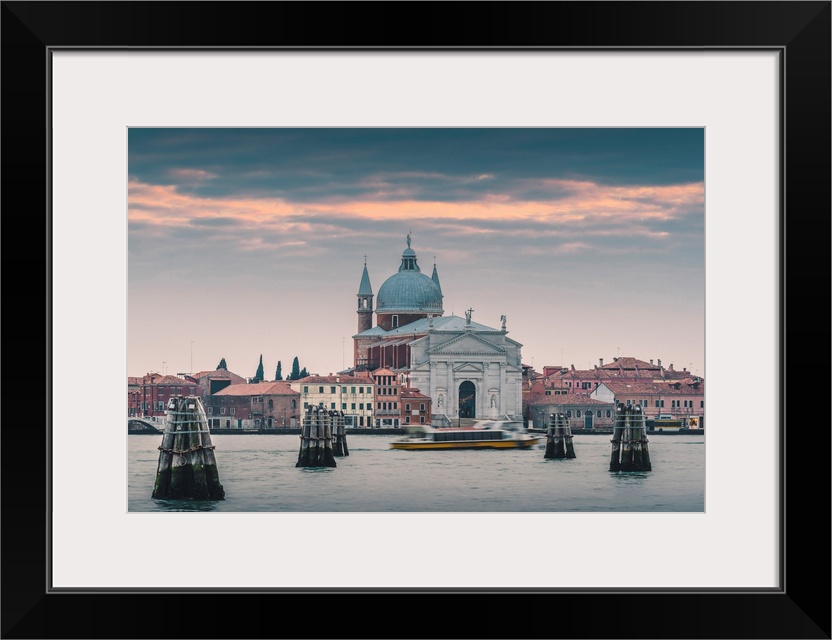 <p>Church Of Santissimo Redentore And Venetian "Briccole", Venice, Veneto, Italy. A Briccola Is A Group Of Piles Used To Mark The Navigable Channels.</p>