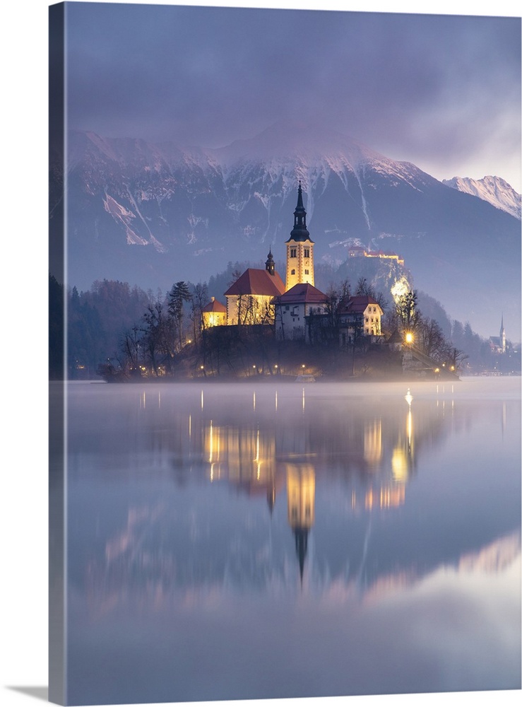 <p>Church of the Assumption of the Blessed Virgin Mary, on Bled island, Lake Bled, in winter, with the Julian Alps in the distance, Bled, Slovenia.</p>