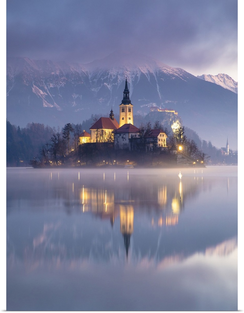 <p>Church of the Assumption of the Blessed Virgin Mary, on Bled island, Lake Bled, in winter, with the Julian Alps in the distance, Bled, Slovenia.</p>