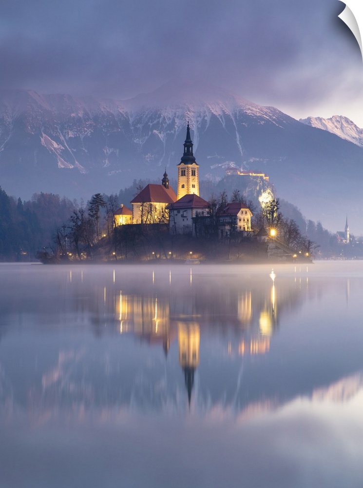 <p>Church of the Assumption of the Blessed Virgin Mary, on Bled island, Lake Bled, in winter, with the Julian Alps in the distance, Bled, Slovenia.</p>