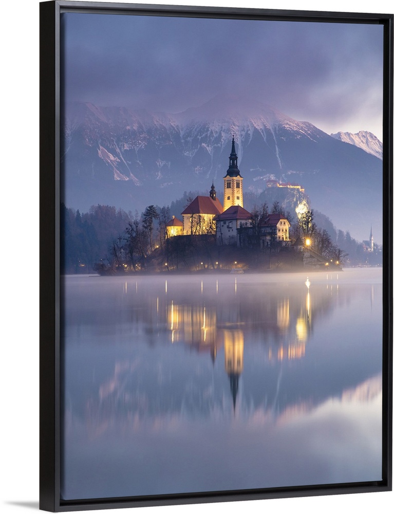 <p>Church of the Assumption of the Blessed Virgin Mary, on Bled island, Lake Bled, in winter, with the Julian Alps in the distance, Bled, Slovenia.</p>