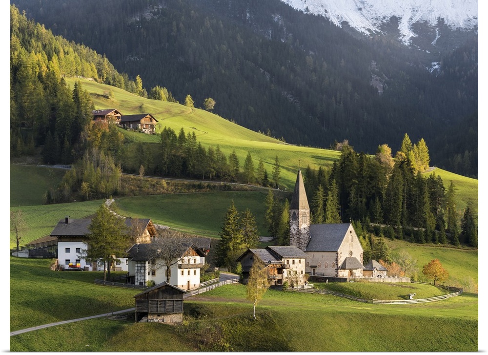 <p>Church Sankt Magdalena in Villnoess valley in autumn, Geisler Mountains. Italy, South Tyrol.</p>