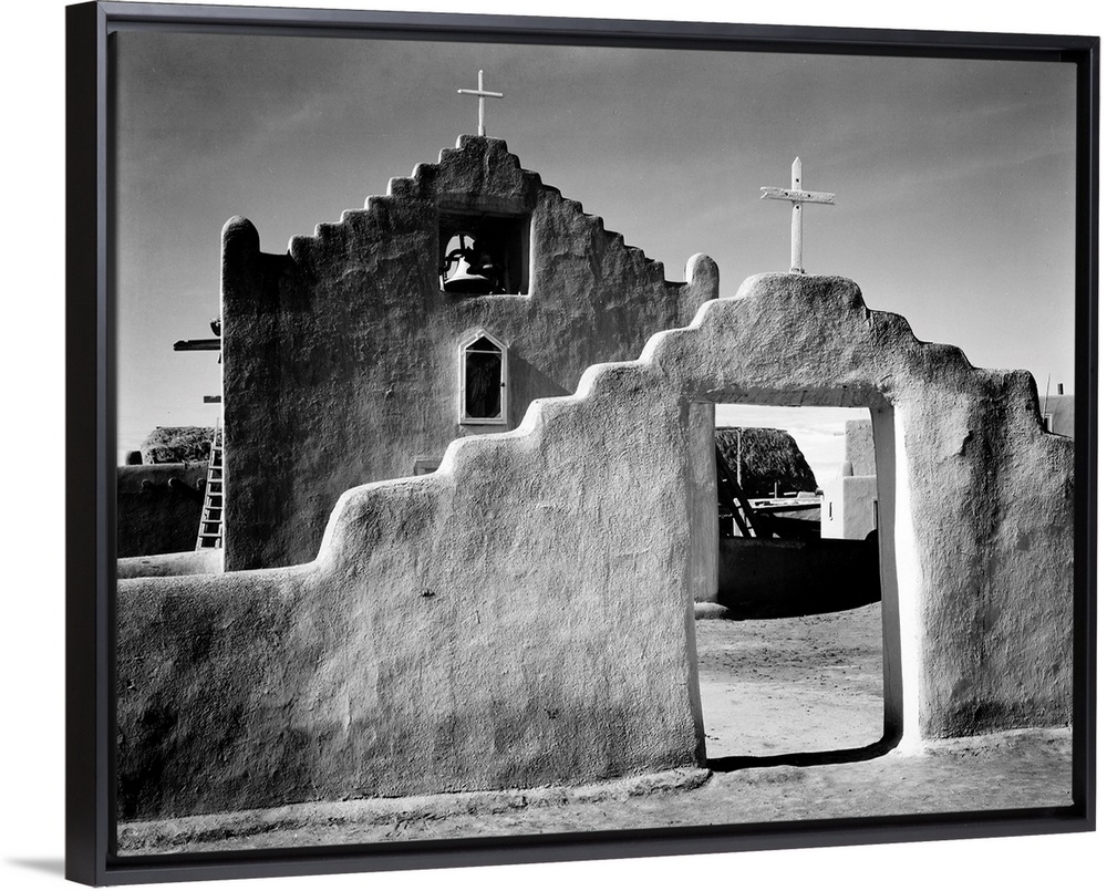 <p>Church, Taos Pueblo, New Mexico, 1941, full side view of entrance with gate to the right.</p>