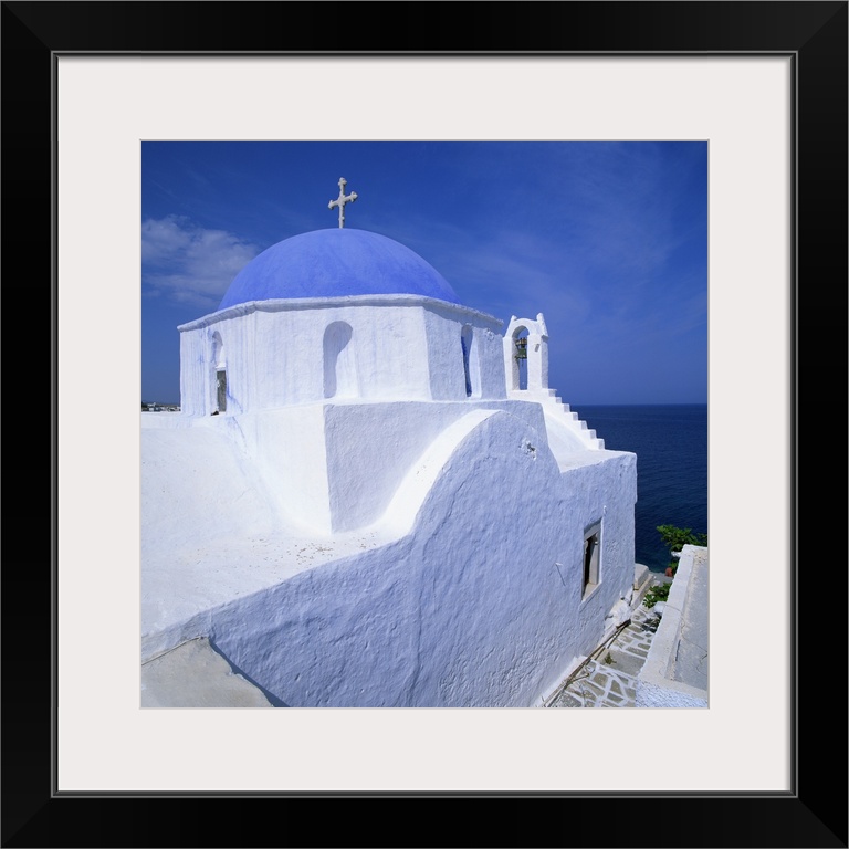 <p>Church with blue dome in Santorini, Greece</p>