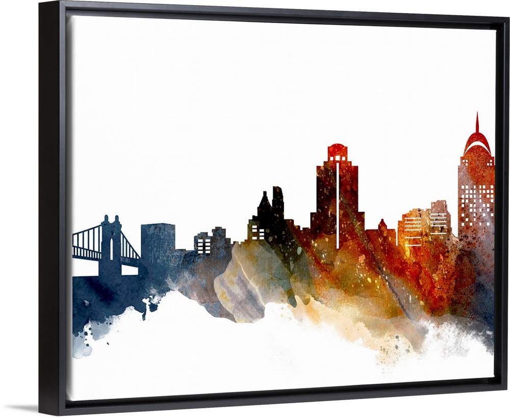 <p>The Cincinnati city skyline in colorful watercolor splashes.</p>