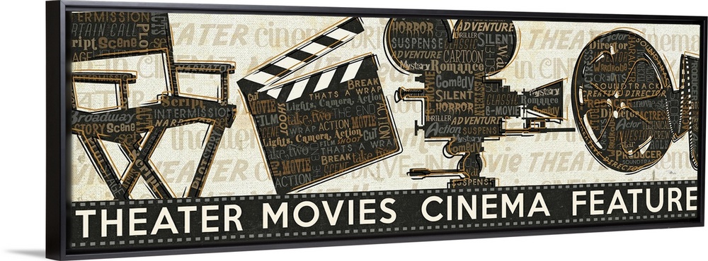 <p>Landscape, giant wall hanging of movie related imagery, including the silhouettes of a directors chair, clap board, a movie film, and a projector. These objects as well as the background a full of words describing movies.</p>