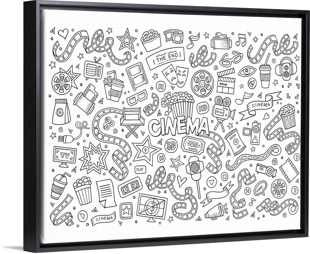 <p>An assortment of movie-themed objects, including film reels and popcorn, surrounding the word "Cinema." Perfect for Coloring Canvas.</p>