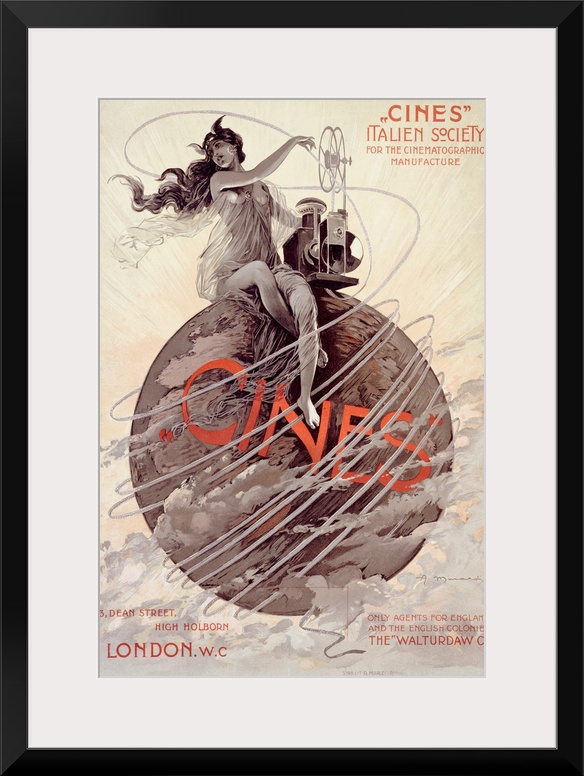<p>This vertical Art Deco poster advertises a cinema related event in London with an illustration of a woman seated on a globe wrapped in film coming out a projector next to the woman.</p>