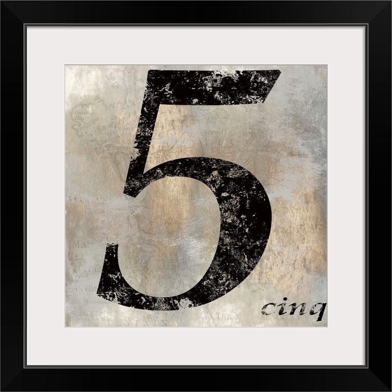 <p>French 5 sign in black, gold, and gray hues with a faint illustration of a map on the background.</p>