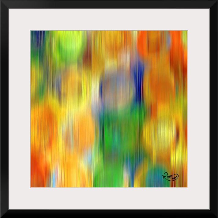 <p>Square abstract art with bleeding vertical lines of color with faint circles behind them.</p>