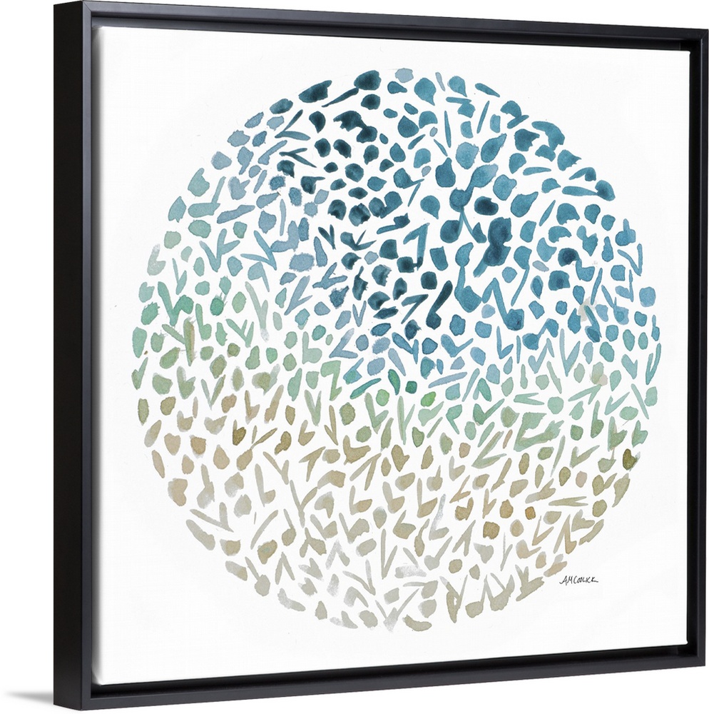 <p>An abstract watercolor painting of flowers making up a circle with blue, green, tan, and gray fading colors.</p>