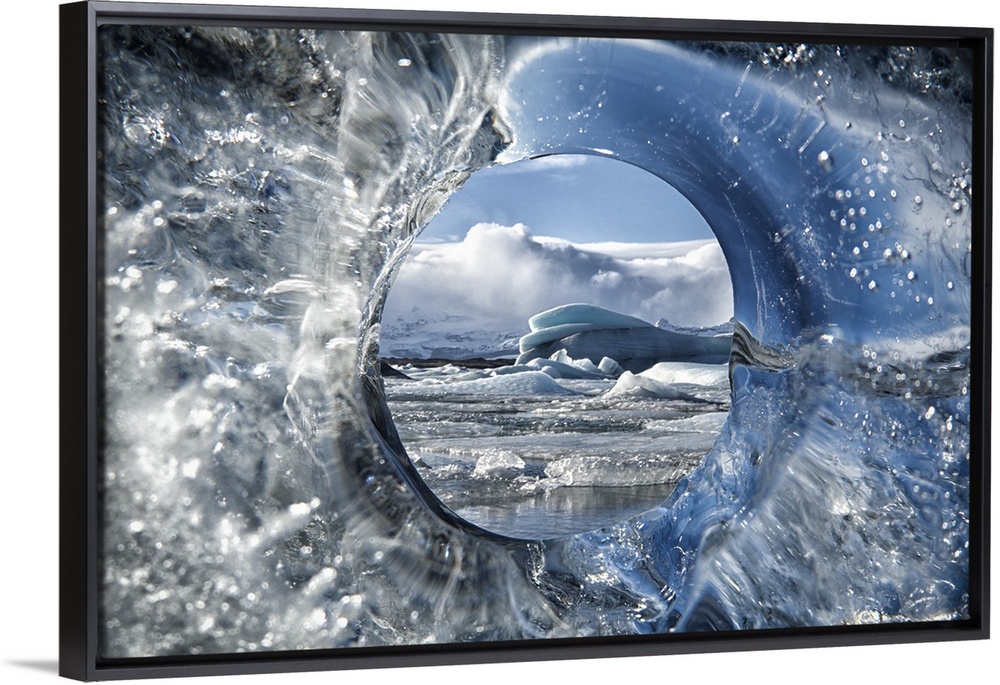 <p>View through the hole in the ice of an iceberg, Iceland.</p>