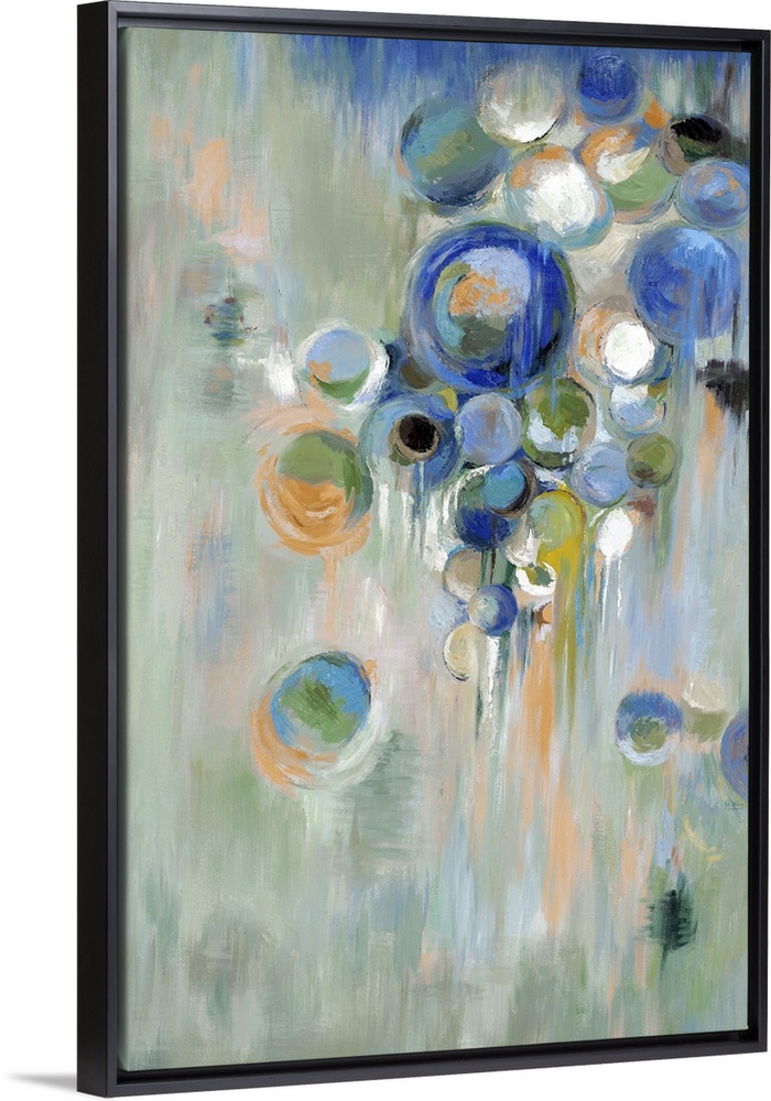 <p>Home decor abstract artwork of blue circles of different sizes against a pale green background.</p>