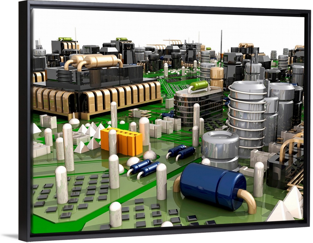 <p>Circuit board. Computer artwork depicting city scape made of electronic circuits.</p>