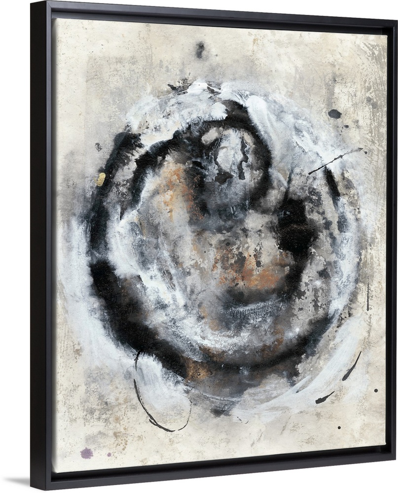 <p>Brush strokes in shades of black, gray and rust pulsate in a circular pattern over a distressed background.</p>