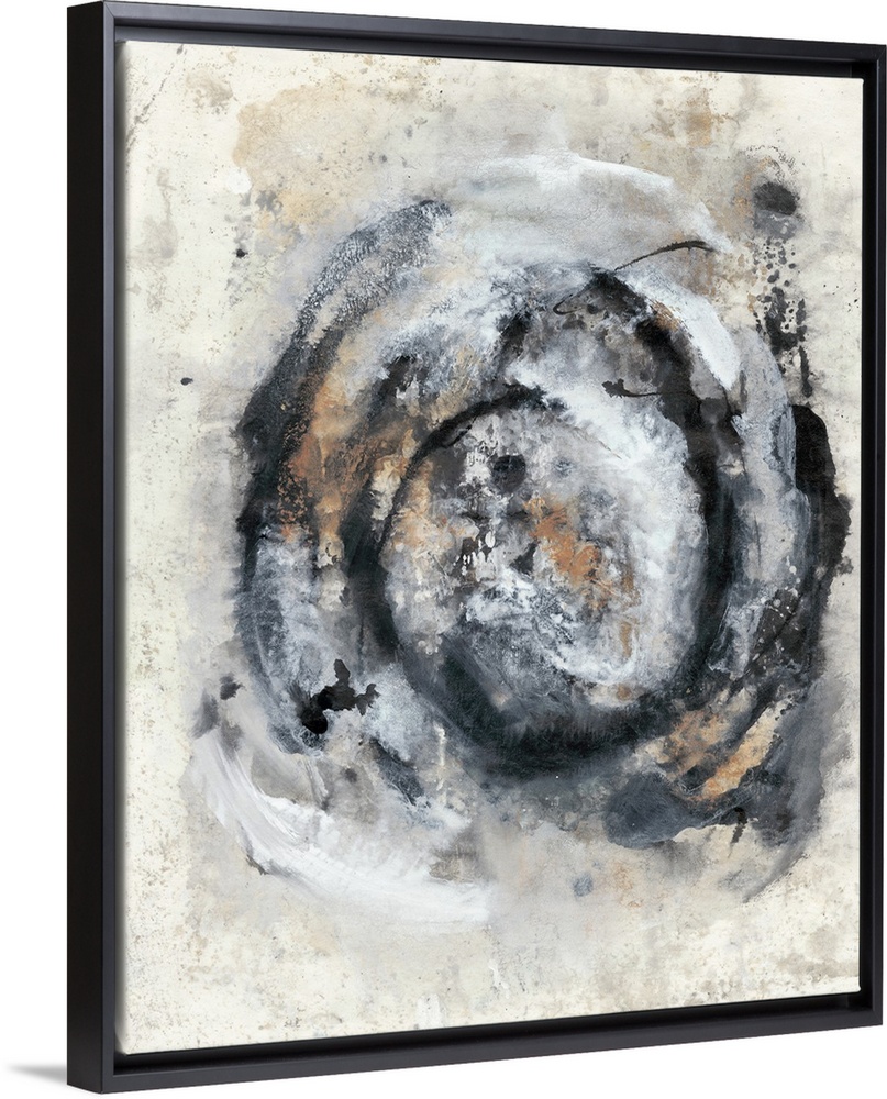 <p>Brush strokes in shades of black, gray and rust pulsate in a circular pattern over a distressed background.</p>