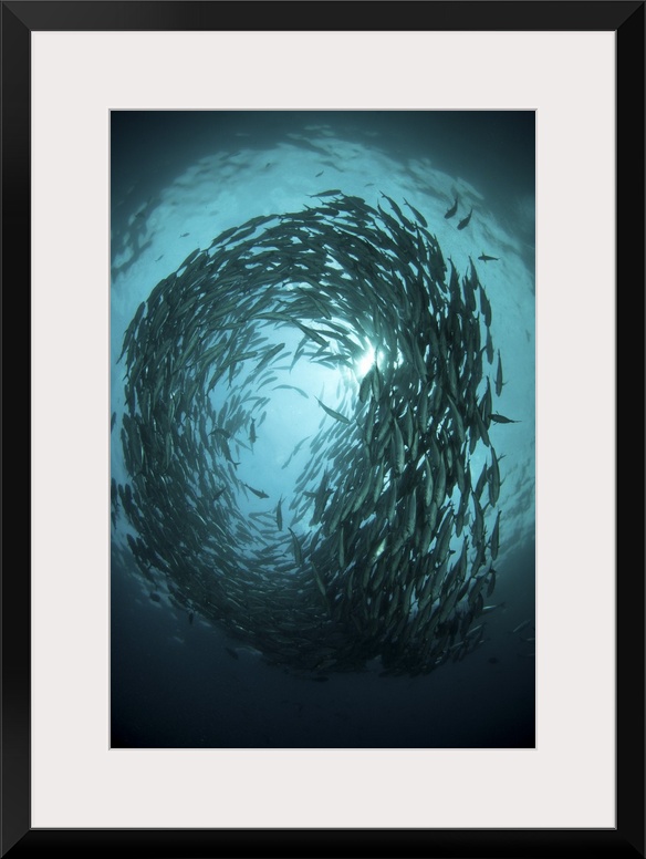<p>Circular school of trevally with sunburst, Bali, Indonesia.</p>