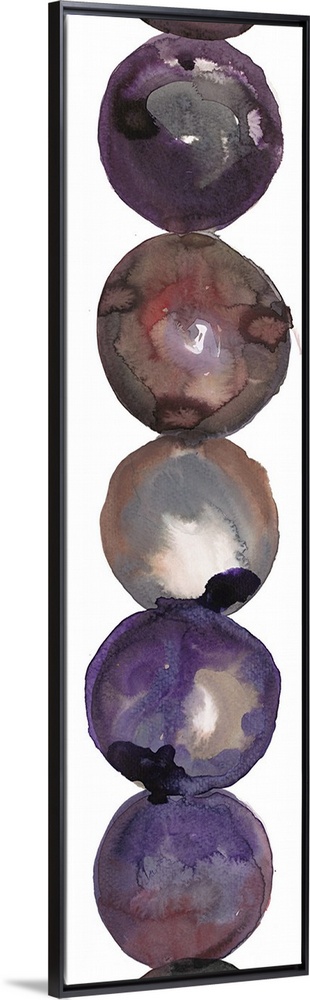 <p>Abstract artwork of a column of circular shapes in shades of grey and red.</p>