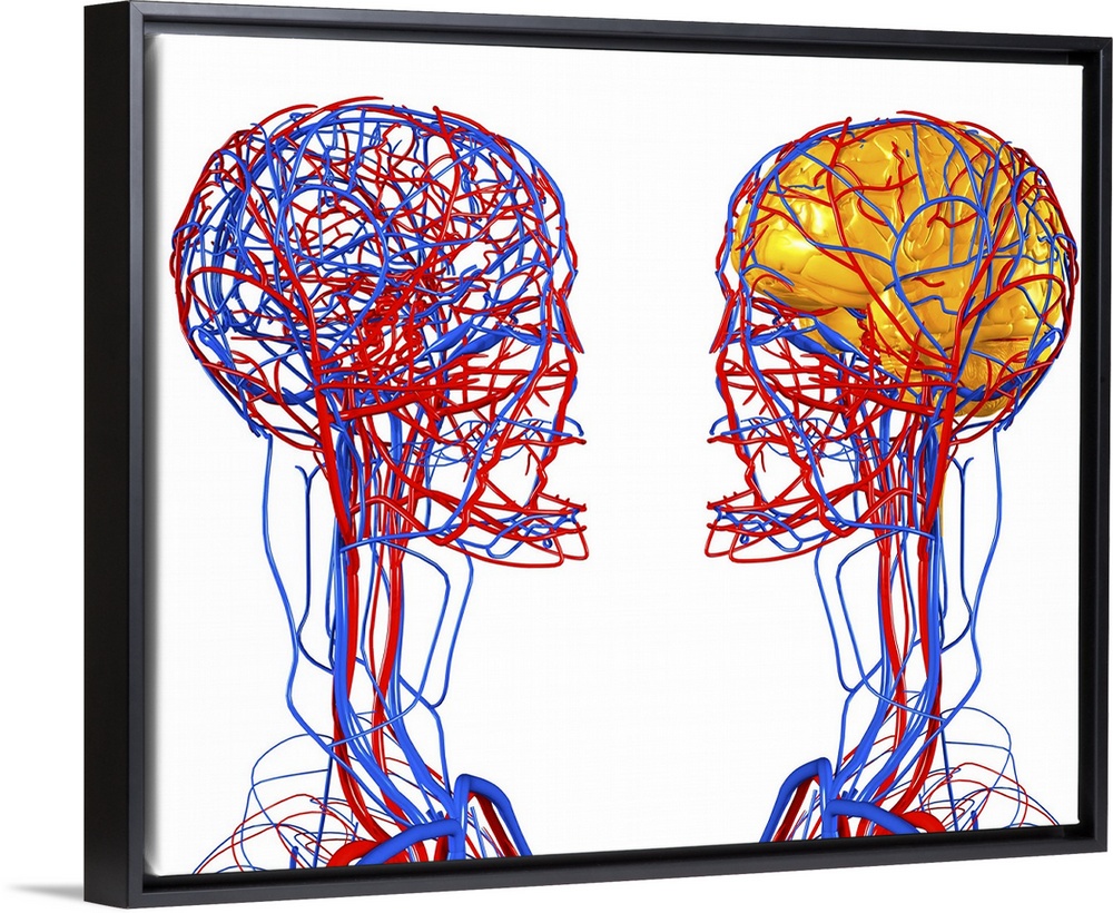 <p>Circulatory system and brain. Computer artwork showing the blood vessels of the head and neck. Also seen is the brain (yellow). The cardiovascular, or circulatory system, transports oxygen and nutrients to all cells and tissues in the body via the blood. Its major components the veins (blue), the arteries (red), the heart (not seen) and the blood.</p>