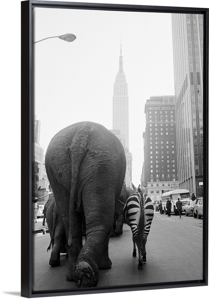 <p>A troupe of elephants and a zebra walk down 33rd Street in Manhattan, hearlding the arrival of Ringling Brothers and Barnum</p>